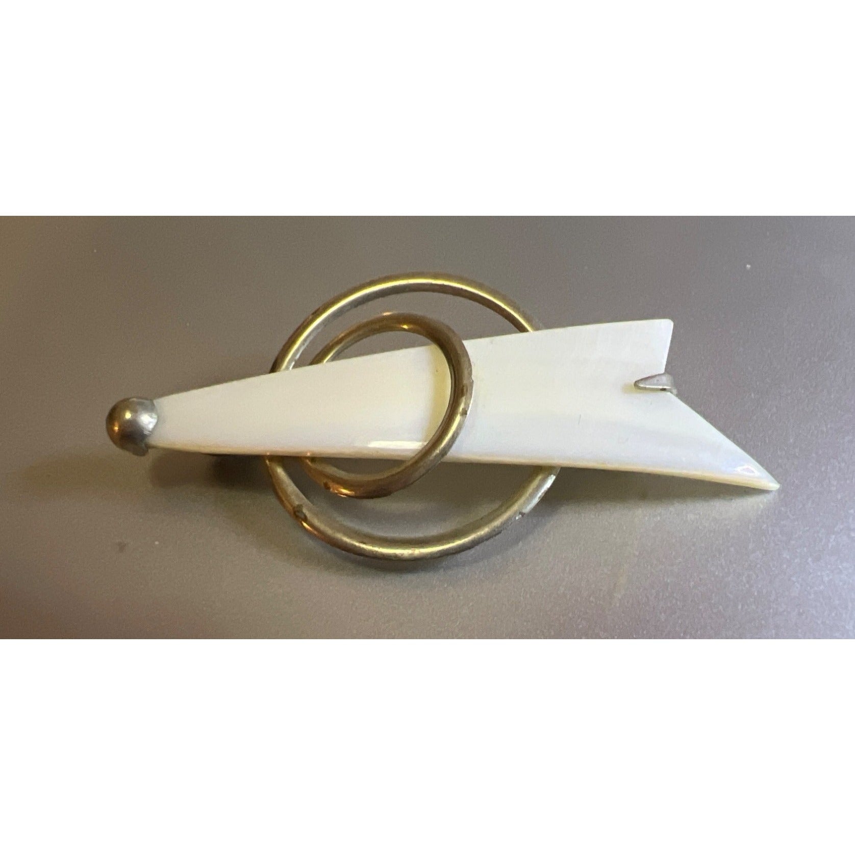 Vintage brooch or pin from the 1950s. It is unsigned. It is silver tone metal with possibly mother of pearl in the center. It measures about 2.25" long. Simple but innovative design.