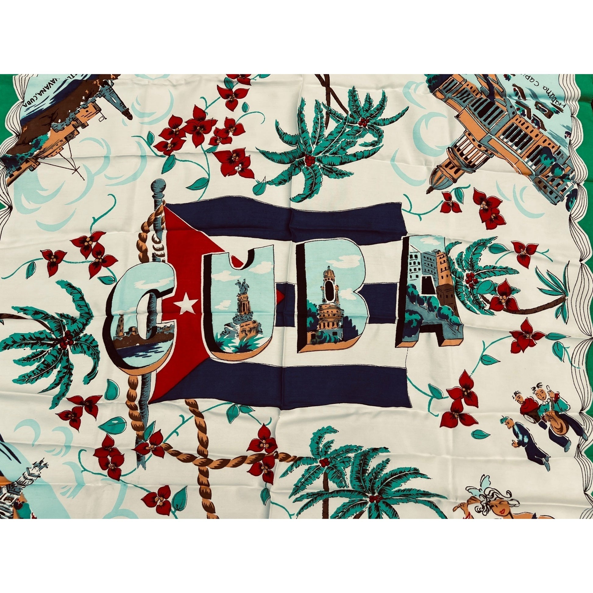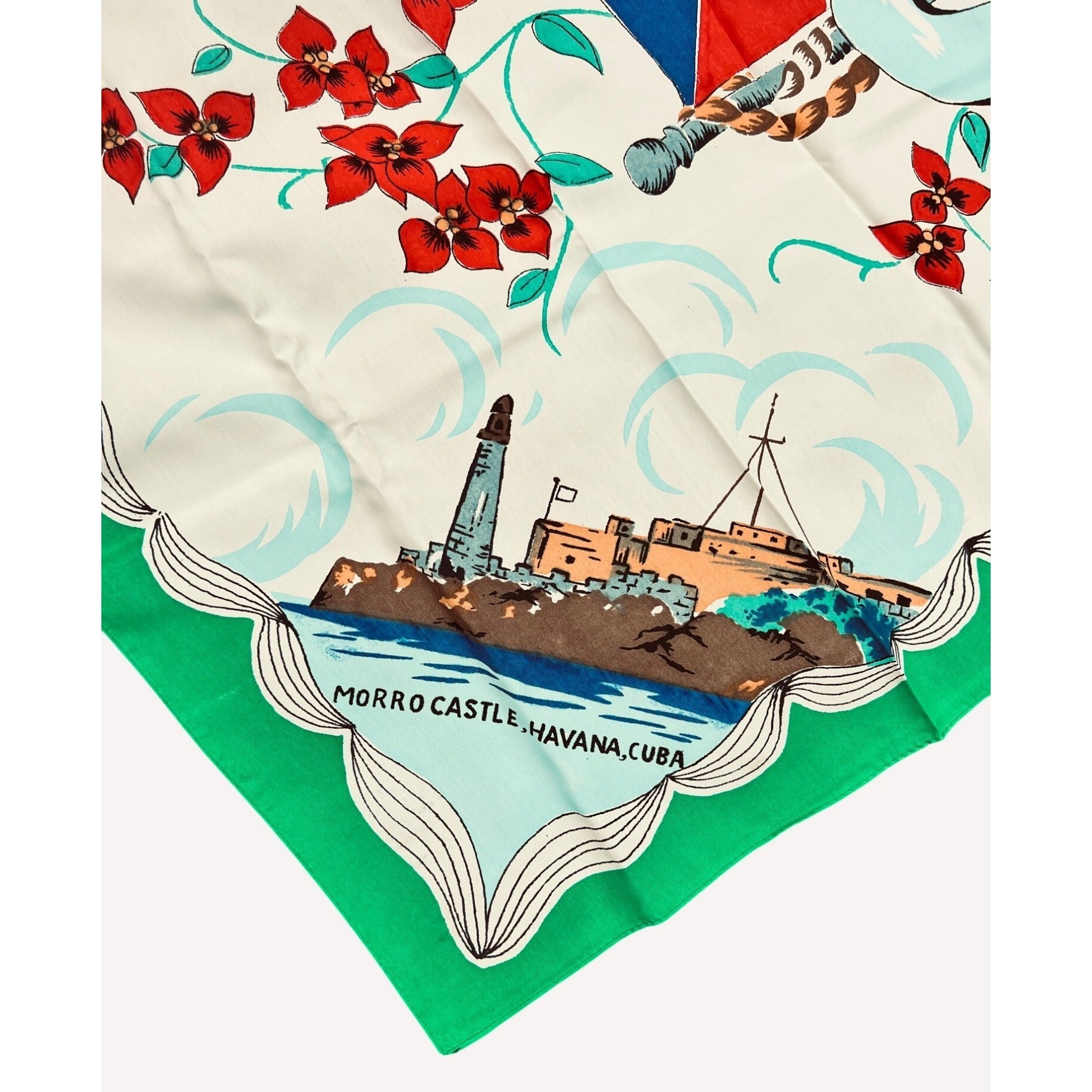 This vintage Cuba souvenir scarf features a vibrant design of Havana dancers, flowers and places; perfect for adding a pop of color to any outfit. Large and silky, it's a unique accessory for travel enthusiasts and collectors alike. Probably from the 1950s.